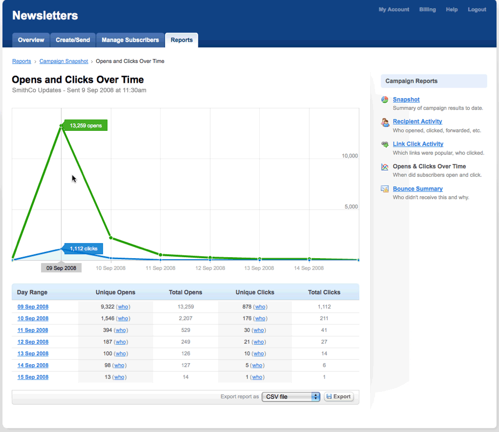 Our email snapshot lets you easily gauge the results of the campaign from a single page. Find out how many recipients opened your email, clicked a link, unsubscribed, forwarded your email to a friend and loads more.