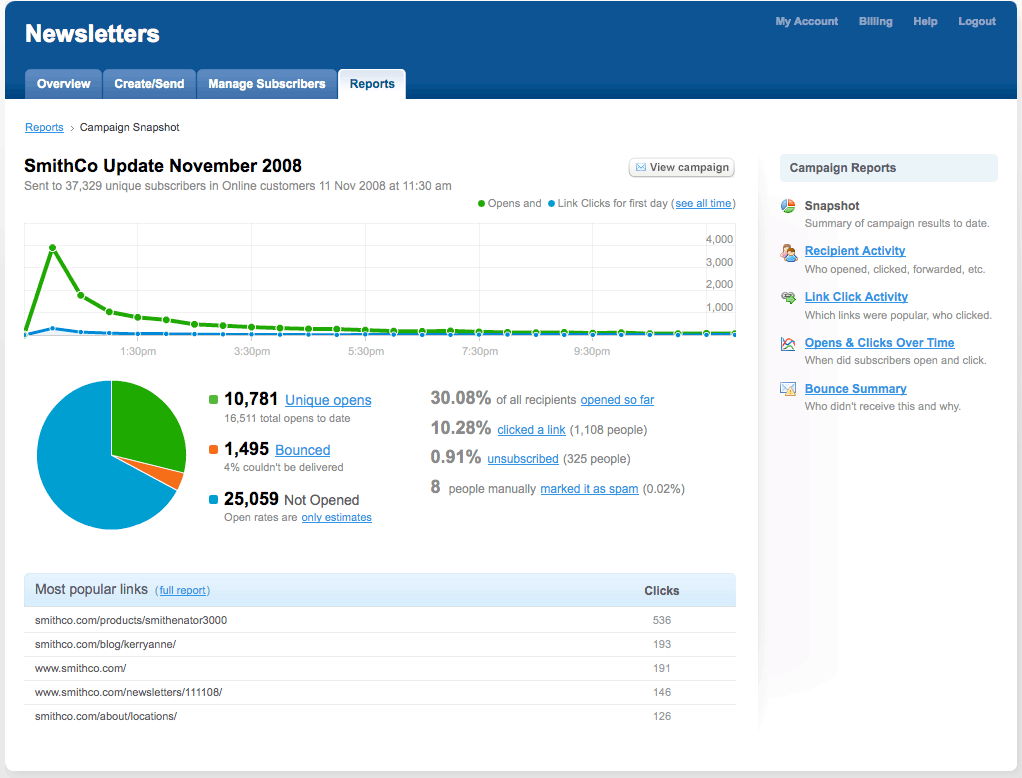Our email snapshot lets you easily gauge the results of the campaign from a single page. Find out how many recipients opened your email, clicked a link, unsubscribed, forwarded your email to a friend and loads more.