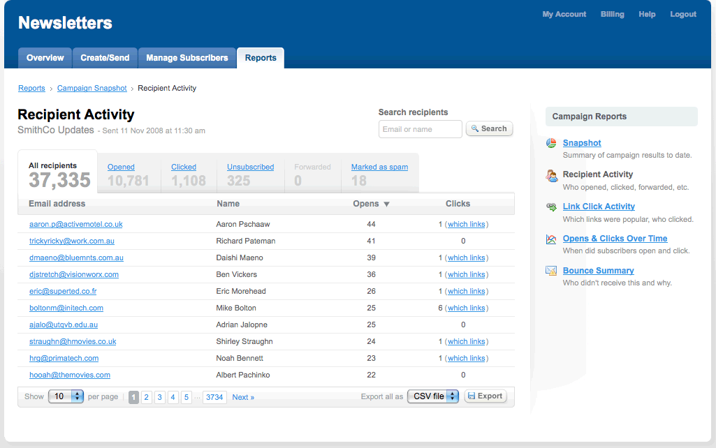 Our recipient activity report lets you get down to some serious detail on your campaign. Easily see who opened, who clicked, who bounced and who unsubscribed. You can even search for a specific subscriber to see exactly what they did with your email.